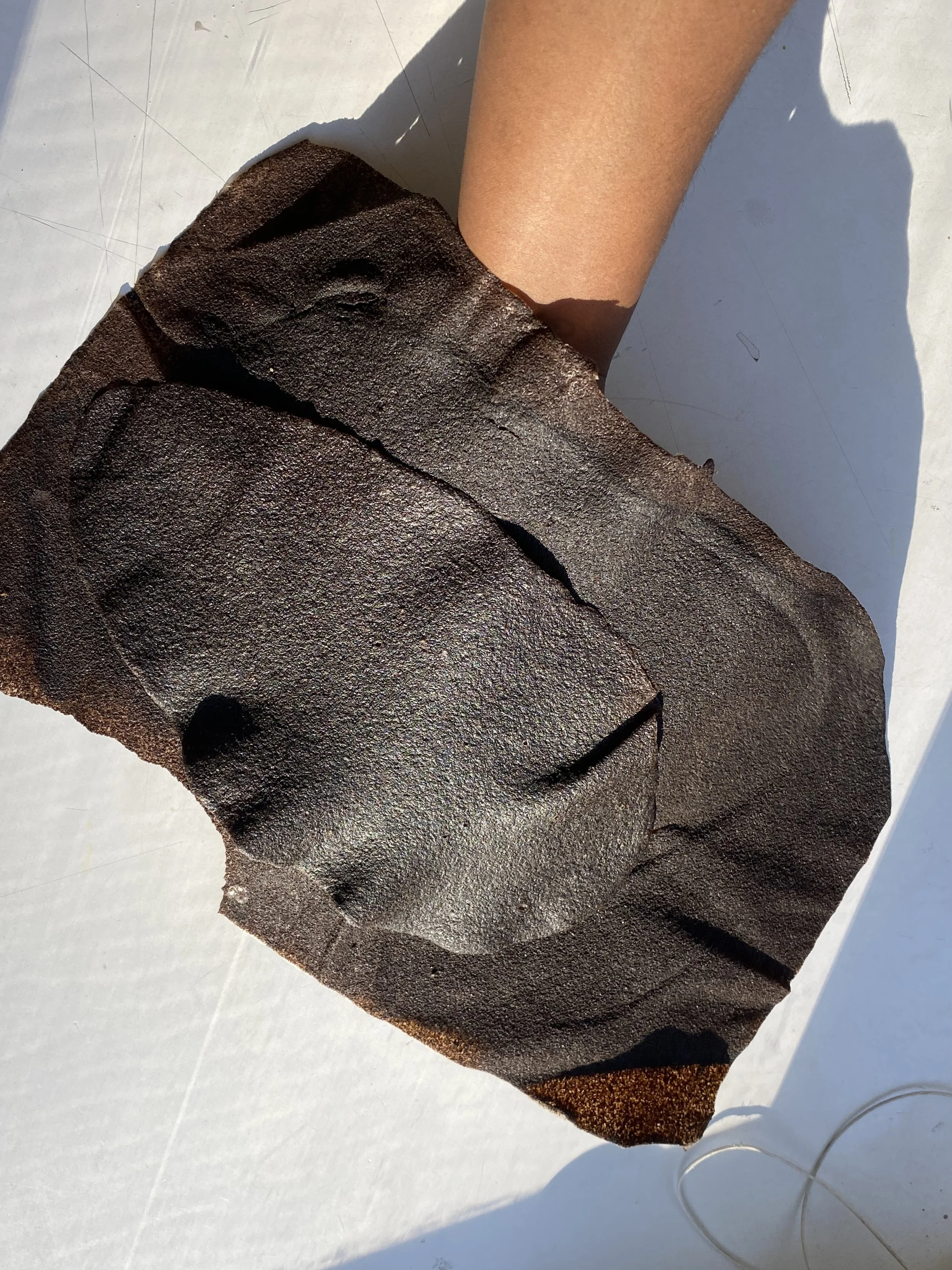 Made from coffee grounds, the sheet is formed through a process of casting and ionic setting rather than tanning. The surface holds visible particles, irregularities, and tonal shifts that come directly from the organic matter embedded within it. No two sheets are the same. Each one records the balance between binder, filler, moisture, and time.