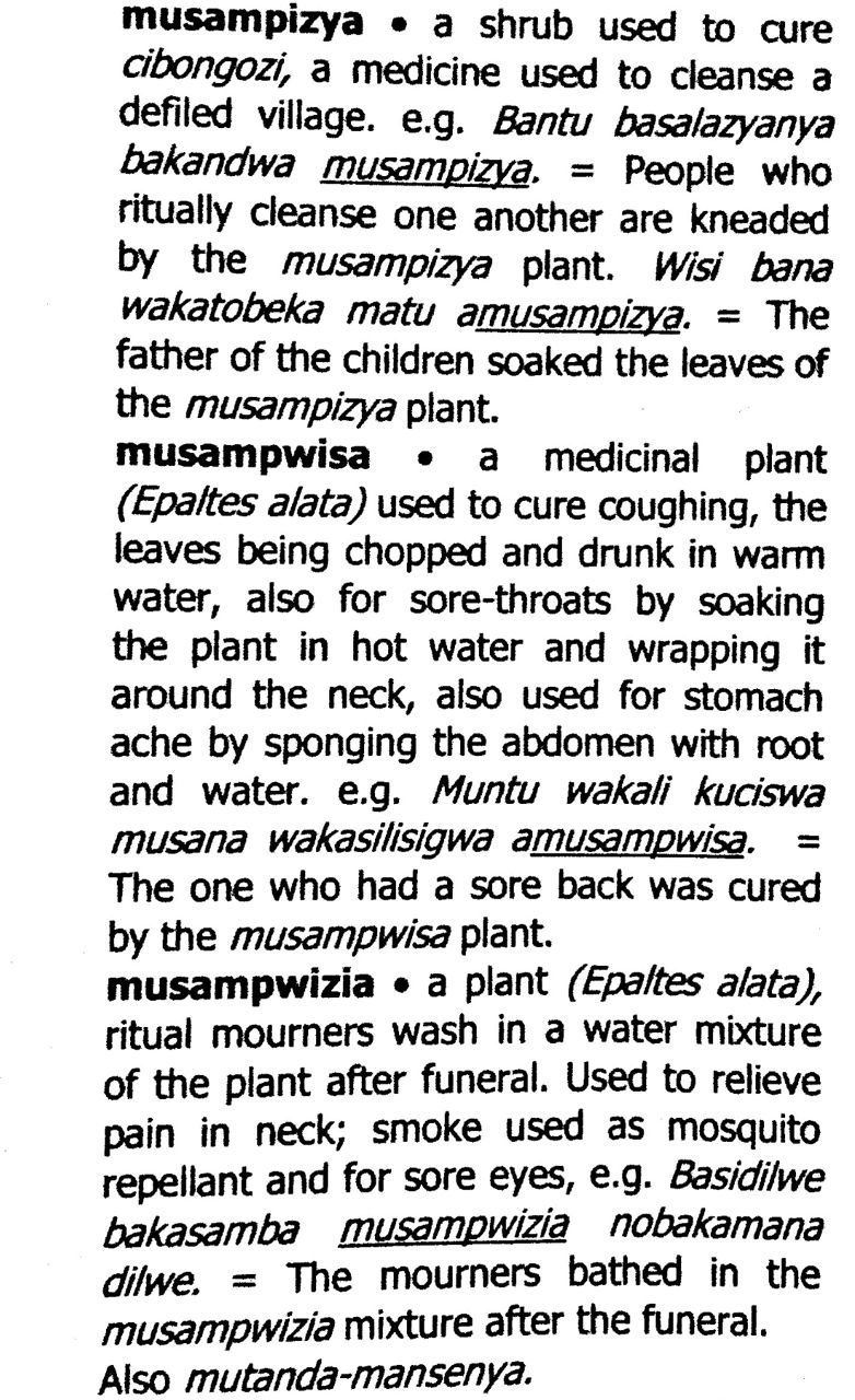 She was born in approximately 1904 in a small village which was erased from the maps and the memory of people in the Gwembe Valley after the 1958 flooding of Kariba. In her teen years, she saw an apparition of her grandmother which asked her to spend twelve uninterrupted hours meditating underneath a Musikili tree. She listened. After feeling a connection like never before, Namusampizya dedicated her life to translating the language of plants into ciTonga through making oils and perfumes which she traded throughout the Gwembe Valley and into the Plateau in areas like Nampeyo and Haanjalika.
