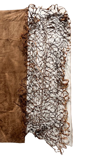 The sculptural element of the piece is an abstract representation of the Mututu (cordia pilossisima) tree from which the Tokaleya community alchemise or derive botanical products. Materials like rope or thread are extracted from the inner bark of the young branches of the Mututu and are used to weave fishing nets (kazamba)or the branches of the trees which are used to make spear handles. This piece speaks to the ways in which the indigenous people still express a resilience to imposition and disruption through the expression of long-standing symbiosis with nature and botanical material within the present.