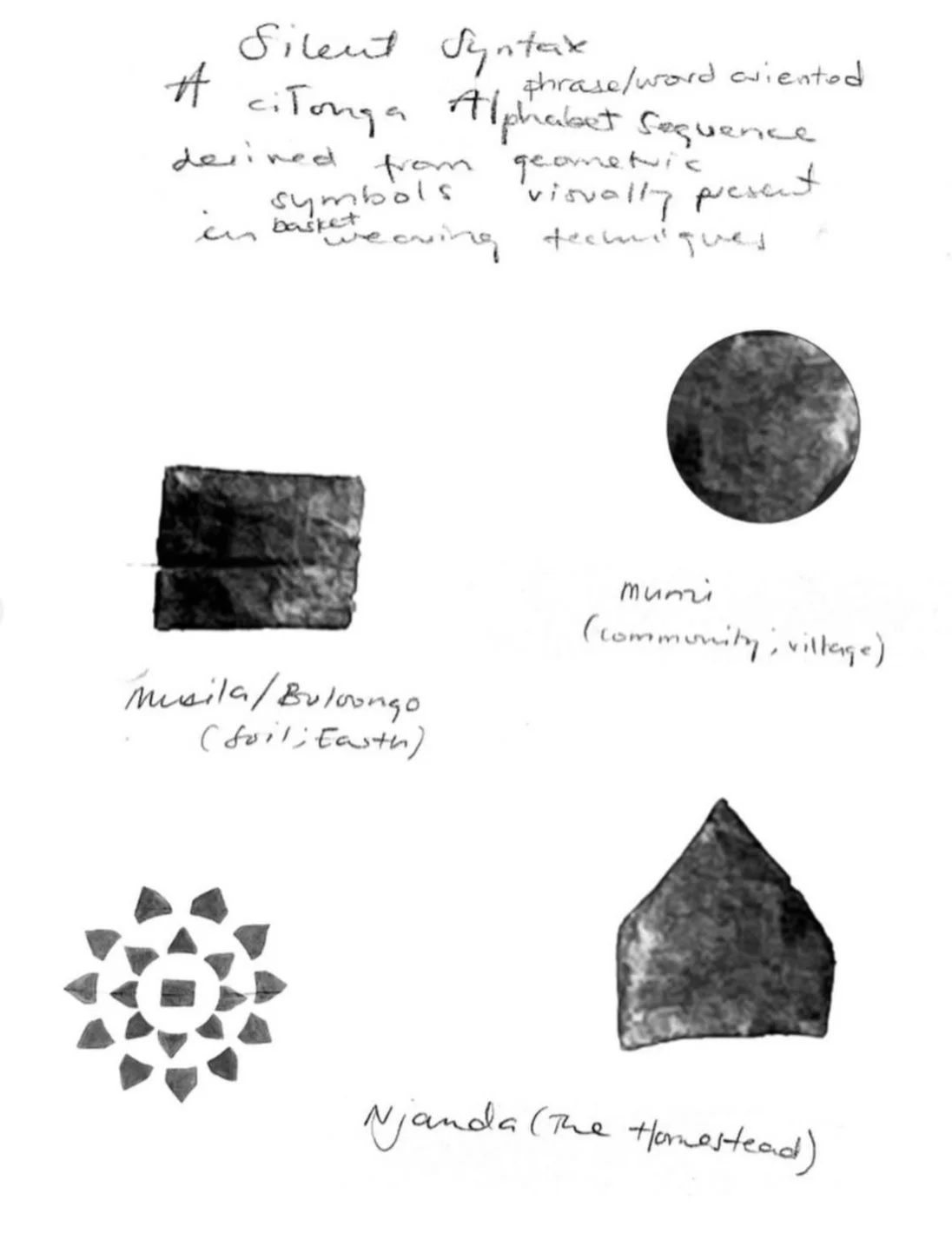 I was thinking about how in many cases words that exist in English often cannot be translated into ciTonga and the concepts or trajectories those words were given to similarly don’t translate into ciTonga or the way of life of the baTonga. Ethnobotany was one of the words I was evaluating using this framework. Ethnobotany is the name given to the study of the relationship between plants and people and would therefore be insufficient in encapsulating what IS the relationship between people and plants and opposed to its study. That’s where this letter/pictograph called musampizya has its root. In written (in the Latin alphabet) and oral ciTonga this word translates a specific type of shrub used to cleanse spaces and people. A morphed version of this word in ciTonga musampwisa is also used to refer to the epaltes alata flower which was used medicinally. Another morphed word is musampwizia which refers to the same plant but in the context of ritual mourning. It represents the symbolic non verbal or non academicised expression of the symbiosis between us (as baTonga) and the earth/natural environment/plant ecologies.